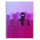 Spooky notebook with a geometric conceptual illustration of a ghost and shadow like human figure in a crowd of people. The different person is a dark, black figure with glowing eyes. It stands out from the crowd, which consists of dark purple humanoid shapes. Though alone, the different one is happy to be a weirdo.