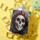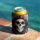 Can cooler with an illustration of a skeleton wearing a hooded jacket with an orange witch's hat on top. Surrounded by cute and spooky pumpkins. A glowing moon in the back with a single bat flying nearby. Fun autumn Halloween design.