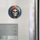 A magnet with an illustration of a skeleton wearing a hooded jacket with an orange witch's hat on top. A glowing moon in the back with a single bat flying nearby. Fun autumn Halloween design.