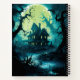 Dead, leafless trees reach out to a dirt path leading to a creepy haunted house. Turquoise mist surrounds the path and a large green moon rises behind the house. This is a fun piece of artwork for Halloween and horror lovers.