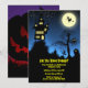 A scary haunted house perched on top of a hill with a grave yard against a dark blue sky. There's a full moon with a wicked witch flying across it. Very fun and scary design for your Halloween party invitations.
