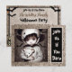 Creepy Halloween party invitations. Spooky little ethnic child ghost with big scary eyes holding super frightening dolls.