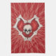 This kitchen hand towel is dark red with a creepy red heart circled with white bones and a skull in the centre on white spiral lines.