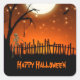 A walking dead skeleton standing near a hangman's noose in a grave yard with a full moon and orange sky background. Very fun and scary design for your Halloween party stickers.