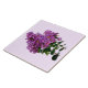 A cluster of vibrant purple flowers on a crepe myrtle bush with delicate petals is set against a soft, pale background. The arrangement is complemented by dark green leaves, adding contrast and depth.