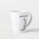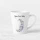 This Latte mug has a white crescent moon with colourful markings in blue, yellow and purple with a pretty face that has blue eyes and pink lips. Cusomize your text at the top with the template.