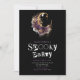 This Halloween party invitation sets the stage for a hauntingly stylish event, with its black background and eerie font that spell out "Spooky Party" in white and purple. The font resembles cut-out letters from a horror magazine, adding to the creepy vibe. At the centre of the invitation is a super creepy decorated skull, adorned with boho green and blush flowers and greenery, creating a macabre yet stylish focal point.