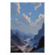 A colossal crescent moon hangs low over an endless range of jagged indigo mountains, bathing the scene in soft silver-blue light. Thick mist flows through deep valleys where a winding turquoise river reflects the lunar glow and fading peach-rose horizon. Voluminous clouds in apricot, lavender, and rose drift across the upper sky while rocky peaks stand in silent majesty. The composition evokes cosmic wonder, profound stillness, gentle melancholy, the sublime scale of nature, and the quiet magic of standing at the boundary between worlds—ideal for meditation rooms, bedrooms, home offices, therapy spaces, minimalist living areas, or as deeply calming gifts for anyone seeking peace, mindfulness, lunar connection, awe-inspired reflection, or reminders of vast beauty beyond the everyday.