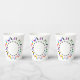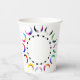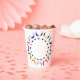 Celebrate queer pride in every detail with this epic paper cup party set featuring a circle of crescent moons in vibrant pride flag colours surrounding a ring of tiny black hearts, repeated in different rotations on one side and an enlarged copy of the full design on the other.