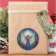 This round fantasy inspired sticker features a stained glass illustration of a moonlit fairy in a flowing purple gown with iridescent wings, holding a staff amid enchanted forest and crescent moon.