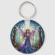 This fantasy keychain features a stained glass style illustration of a moonlit fairy in a flowing purple gown with iridescent wings, holding a staff amid enchanted forest and crescent moon.