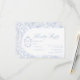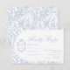 Light delft blue floral RSVP response card, designed in a refined blend of chinoiserie and French toile de Jouy style. The soft botanical illustrations frame an arched layout featuring an elegant wedding crest monogram, perfect for couples who love vintage, historic, and European-inspired aesthetics. Classic script typography pairs beautifully with the ceramic-blue palette, making this design an effortless nod to the tradition of “something blue.” Fully customisable with your RSVP date, guest name and menu choice, it’s an exquisite choice for any romantic or sophisticated wedding theme.