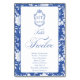 Delft blue floral table number card, designed in a refined blend of chinoiserie and French toile de Jouy style. The soft botanical illustrations frame an arched layout featuring an elegant wedding crest monogram, perfect for couples who love vintage, historic, and European-inspired aesthetics. Classic script typography pairs beautifully with the ceramic-blue palette, making this design an effortless nod to the tradition of “something blue.” Fully customizable with your guest's names, wedding crest and in this design table number: Twelve, it’s an exquisite choice for any romantic or sophisticated wedding theme.