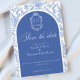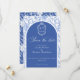 Delft blue floral save the date card, designed in a refined blend of chinoiserie and French toile de Jouy style. The soft botanical illustrations frame an arched layout featuring an elegant wedding crest monogram, perfect for couples who love vintage, historic, and European-inspired aesthetics. Classic script typography pairs beautifully with the ceramic-blue palette, making this design an effortless nod to the tradition of “something blue.” Fully customizable with your names, date, and location, it’s an exquisite choice for any romantic or sophisticated wedding theme.
