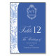 Delft blue floral table number card, designed in a refined blend of chinoiserie and French toile de Jouy style. The soft botanical illustrations frame an arched layout featuring an elegant wedding crest monogram, perfect for couples who love vintage, historic, and European-inspired aesthetics. Classic script typography pairs beautifully with the ceramic-blue palette, making this design an effortless nod to the tradition of “something blue.” Fully customizable with your names, wedding crest and table number, it’s an exquisite choice for any romantic or sophisticated wedding theme.