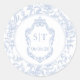 Soft delft blue floral round sticker, designed in a refined blend of chinoiserie and French toile de Jouy style. The soft botanical illustrations frame an arched layout featuring an elegant wedding crest monogram, perfect for couples who love vintage, historic, and European-inspired aesthetics. Classic typography pairs beautifully with the ceramic-blue palette, making this design an effortless nod to the tradition of “something blue.” Fully customizable with your initials and wedding date, it’s an exquisite choice for any romantic or sophisticated wedding theme.