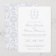 Elegant Dusty Blue Monogram Crest Wedding Invitation: Vintage-inspired line art monogram crest with traditional dusty blue typography. Features a chinoiserie floral pattern on the reverse for timeless sophistication.