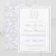 Dusty Blue Monogram Crest Wedding Invitation: Vintage-inspired line art monogram crest with elegant dusty blue typography. Features a chinoiserie floral pattern on the reverse for timeless sophistication.