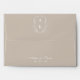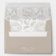 Pale Taupe Monogram Crest Wedding Envelope: Vintage-inspired line art monogram crest in white with elegant pale taupe background. Features a chinoiserie floral pattern on the inside for timeless sophistication. Elegant script font for a formal and classic style.