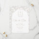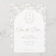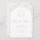 Pale Taupe Monogram Crest Wedding Save The Date: Vintage-inspired line art monogram crest with elegant pale taupe typography. Features a chinoiserie floral pattern in the shape of an arch and on the reverse for timeless sophistication. Elegant script font for a formal and classic style.