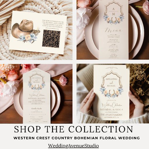 Celebrate your love with rustic charm and bohemian flair using our Crest Western Country Bohemian Floral Wedding Invitation. This unique invitation captures the essence of a Western country wedding infused with the free-spirited beauty of bohemian florals.