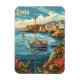 A vibrant and nostalgic depiction of Crete, Greece's largest island, known for its rich history and diverse landscapes. The design captures the island's stunning coastline with crystal-clear waters, rugged mountains, and charming villages like Chania and Rethymnon. Rendered in a vintage style, the artwork evokes the island's serene beauty and cultural richness, inviting viewers to explore its ancient ruins, lush olive groves, and traditional Greek charm.