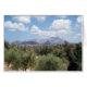 A scenic view in Crete, Greece with olive trees and mountains in the background.