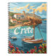 A vibrant and nostalgic depiction of Crete, Greece's largest island, celebrated for its diverse landscapes and rich cultural heritage. The design features the island's dramatic coastline, with crystal-clear waters and golden beaches, ancient ruins like the Palace of Knossos, and charming villages such as Chania and Rethymnon. Rendered in a vintage style, the artwork captures the island's timeless beauty and inviting atmosphere, inviting viewers to explore its historical sites and natural splendour