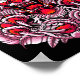 A fearsome, red dragon's head dominates the centre of the image, its eyes blazing with fury. The dragon's mouth is open wide, revealing sharp teeth, and its claws are extended, grasping skulls. The background features intricate, floral patterns and swirling lines.