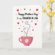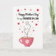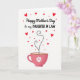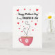 Designed with a bright white background, this card sets a light, airy stage for a loving Mother’s Day message. Near the top, “Happy Mother’s Day” appears in flowing black lettering, with “to my DAUGHTER IN LAW” placed just below in uppercase black text for extra emphasis. Around the words, red hearts and tiny red dots are sprinkled like confetti, adding a sweet, affectionate mood ❤️. The lower area features a large pink teacup, and its curved side is decorated with a simple white flower that resembles a daisy 🌼. Rising from the cup is a trail of small black dots that feels like a gentle sigh, shaping into a heart as if sending a quiet, caring glance upward. That dotted trail then continues into a loose curl, giving the scene a soft sense of closeness and connection. The cup sits centred near the bottom, with the heart-shaped dotted “steam” floating above it against the open white space. Share your Mother’s Day sentiments with love and appreciation.