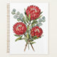 Elegant watercolor illustration of vibrant red protea blooms with soft green eucalyptus leaves, delicately painted to capture natural beauty and botanical charm