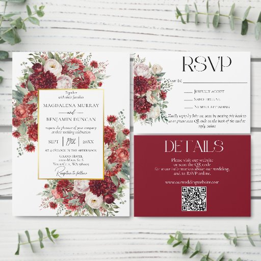 Elegant watercolor lush floral design in red, burgundy, cream, blush, and green colours, with dahlias, roses, chrysanthemums, and other flowers. Classic faux gold glitter oval double frame, with modern and elegant calligraphy and serif fonts.