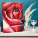 with original art design from watercolour painting of crimson deep red English rose in close focus, macro style by Sacha Grossel. This botanical subject is bright and intensely coloured in scarlet floral to convey love and passion.