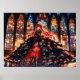 A captivating girl in a black and crimson gown stands gracefully in a cathedral with vibrant stained glass windows. The gothic elegance of her dress, adorned with blooming roses, contrasts beautifully with her fiery flowing hair.