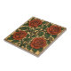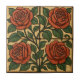 The vibrant red-orange hues of the roses are beautifully complemented by lush, deep green leaves and intertwining dark brown vines that gracefully create a continuous botanical tableau. The entire design is set against a warm, antique gold background with a subtly textured finish, enhancing its vintage charm. This tile set celebrates nature's beauty with its organic forms and rich, earthy colour palette. The strong black outlines around each element lend a distinct, handcrafted appeal. Perfect for creating a stunning focal point in a kitchen backsplash, a charming border in a bathroom, or as an accent in a living area, this tile brings an air of classic sophistication and natural grace to any interior.