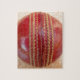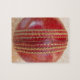 The artwork features a tightly cropped view of a red leather cricket ball. The focus is sharp on the central seam and the surrounding leather, showcasing the detailed stitching and the texture of the ball's surface. The composition is simple yet impactful, drawing the viewer's eye to the craftsmanship and the iconic nature of the object.