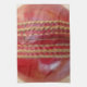 The artwork features a tightly cropped view of a red leather cricket ball. The focus is sharp on the central seam and the surrounding leather, showcasing the detailed stitching and the texture of the ball's surface. The composition is simple yet impactful, drawing the viewer's eye to the craftsmanship and the iconic nature of the object.