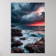 Fierce waves crash against dark rocks under a dramatic sky bathed in crimson and blue hues. A powerful piece that captures nature's wild beauty and the moment a storm meets the sunset.