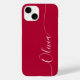 Crimson Elegant White Calligraphy Script Custom Personalised Name iPhone 14 Smart Phone Cases features a modern and trendy simple and stylish design with your personalised name in elegant hand written calligraphy script typography on a crimson background. Designed by ©Evco Studio www.zazzle.com/store/evcostudio