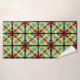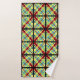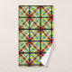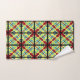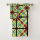 These striking bath towels present a colourful abstract pattern of crisscross lines and stripes in red, orange, green, yellow, blue and black.