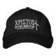 White embroidered design on black, adjustable cap. Cristos is written in Greek for the play on words, "He's not Greek to me." Exclusively from Biblewhiz.com.