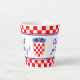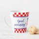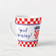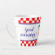 This latte mug features a Croatian greeting "Dobro jutro!" on one side and the English version "Good morning!" on the other side. There are two rows of red and white checkers as well as thin red, white, and blue stripes on top and bottom of the mug. The text is customisable, and the blue calligraphy font matches the colour of the Croatian flag. In the middle, there is the coat of arms (grb in Croatian).