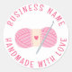 Crochet Handmade Custom Business Name Stickers features a crochet hook and pink yarn with your custom text such as "Handmade with love" in modern typography script on a white background. Personalised by editing the text in the text boxes provided. Perfect for small business, crochet products, envelope seals, gifts and favours. Designed by ©2024 Evco Studio www.zazzle.com/store/evcostudio