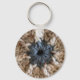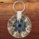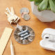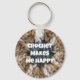 This keychain adds a humourous touch to your day and is perfect for any crochet enthusiast. The background features a photograph of blue and beige yarn crocheted into a starbust pattern. "Crochet Makes Me Happy" is displayed in white font and can easily be customised.