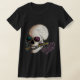 A cartoon skull with yarn for eyes and a crochet hook in it's mouth. The yarn drapes down to read 'crochet or die'. This image has a distressed texture to it to give it a grunge feel.