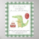 Watercolor kids birthday party. Watercolor Crocodile or Alligator, cake with candles, red balloon. Green cage background.