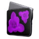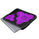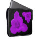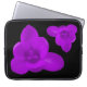 This awesome laptop bag features a photo of a crocus flower that has been digitally altered by adding a filter to turn the flower purple. There are two of these flowers, one upside down and the other the right way up. The flowers are on a black background.