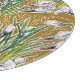 Cutting board featuring botanical floral pattern, elaborated from hand drawn life sketch. Beautiful spring flowers - white crocuses with fresh green leaves on golden brown background, white dots splattering around them.