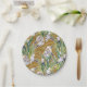Paper plate featuring botanical floral pattern, elaborated from hand drawn life sketch. Beautiful spring flowers - white crocuses with fresh green leaves on golden brown background, white dots splattering around them.