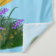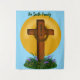 Cross and Crown of Thorns tapestry with John 3:16. Personalized family name on top, brown cross with crown of thorns around it and grass and flowers at the bottom. A bright yellow sun in the back with a blue background.